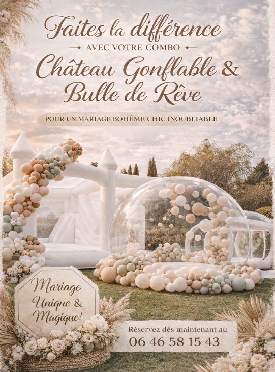Minikids proposent aussi bien des produits pour les petits et les grands. Conçues en interne par notre équipe, nous avons imaginé des structures parfaites pour les mariages, un atout idéal qui, loin de gâcher vos photos de mariage, saura les sublimer, vous garantissant non seulement des photos magiques mais aussi des fous rires garantis ! Spécialiste de la location de château gonflable pour mariage en Gironde, Minikids vous propose des structures haut de gamme, comme notre célèbre château blanc, qui s’intègrent parfaitement à votre décoration.